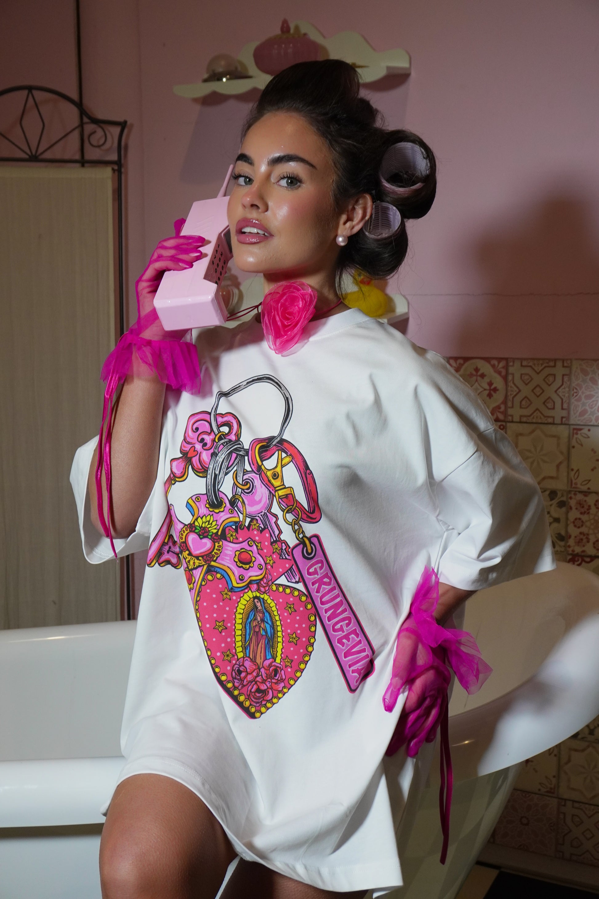 Our GRUNGEVIA Keychain Tee is the ultimate statement piece — bold, girly and full of attitude. Featuring a vibrant pink keyring graphic with signature GRUNGEVIA detailing, this oversized tee is made for standout looks with an effortless fit. Perfect for dressing up, dressing down, and turning heads every time.